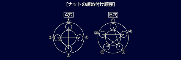 ナットのネジ山が斜めに噛んでネジ山を壊す場合がございます。 - ナットの締め付け順序は図の様に対角線状に取り付けて下さい。また各ボルトに均等なトルクを掛けて、徐々に締め付けて下さい。ホイールの締め付けトルクは、カーメーカー指定トルクを優先して下さい。